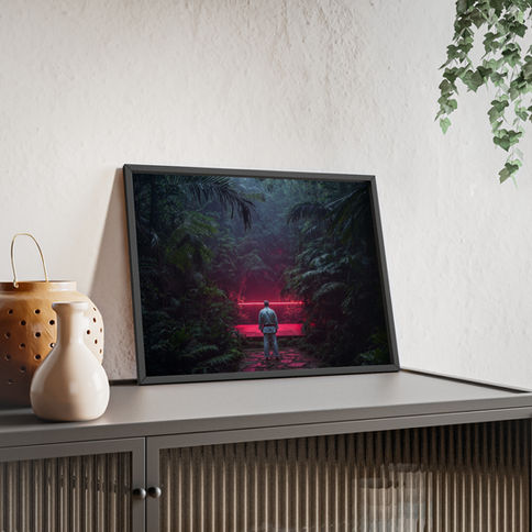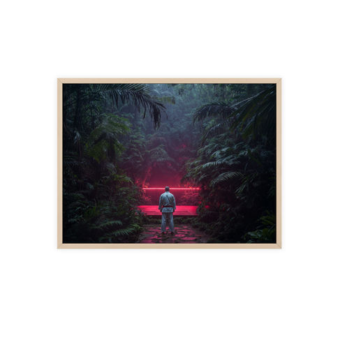 A lone BJJ silhouette stands before a glowing mat deep in the jungle—where nature, discipline, and mystery collide. A surreal tribute to Brazilian Jiu-Jitsu art, martial arts photography, grappling culture, and the quiet obsession that leads you back to the mats, no matter where they are.