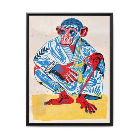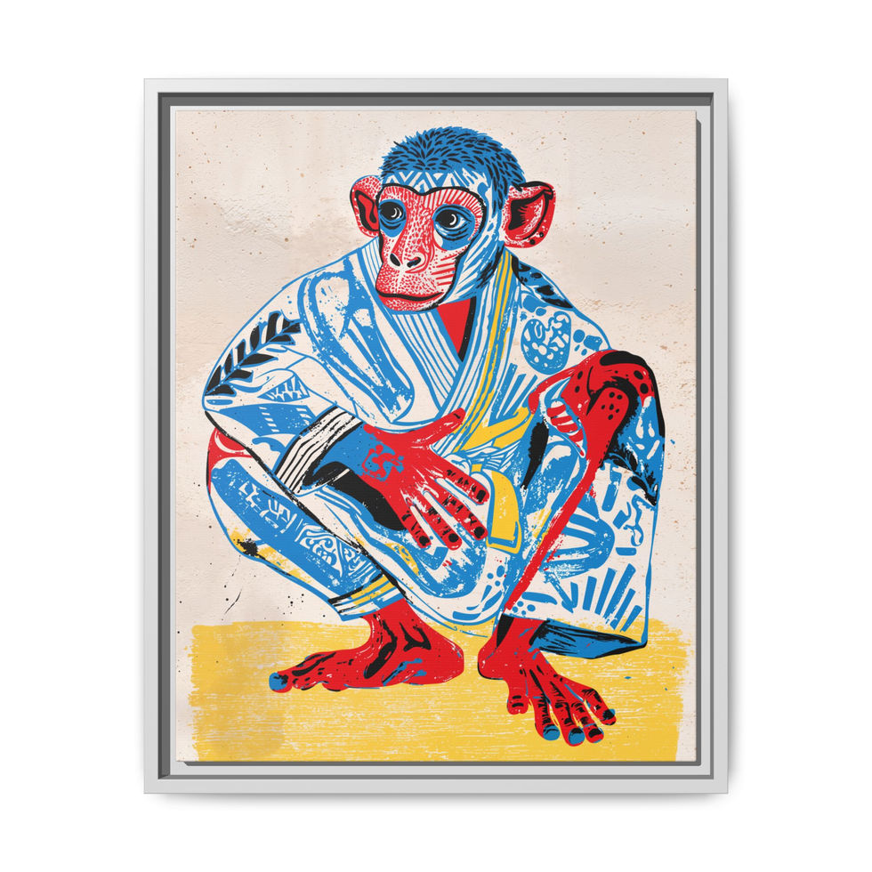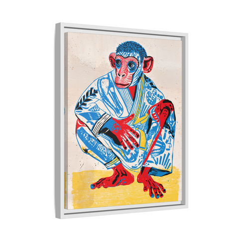 A playful, folk-art inspired illustration of a monkey in a BJJ gi, blending bold colours, animal character design and martial arts culture. Ideal for collectors searching for Brazilian Jiu-Jitsu art, animal artwork, monkey illustration, grappling prints, or unique martial arts wall art with humour and personality.